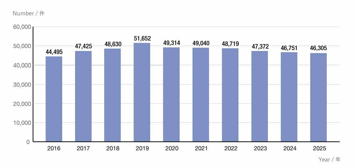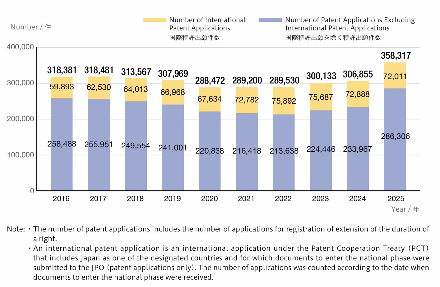 The number of patent applications filed with the Japan Patent Office decreased in 2020 due to the Coronavirus outbreak and remained stable until 2022. It increased slightly until 2024, and in 2025, it increased drastically to 358,317, which shows the record high in the past decade.